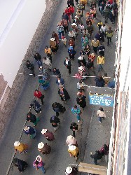 <左:デモ行進中。ボリビアではよくデモがあった 右:暇そうなエンパナーダス屋の少年。この後ちゃんと買ってあげました>